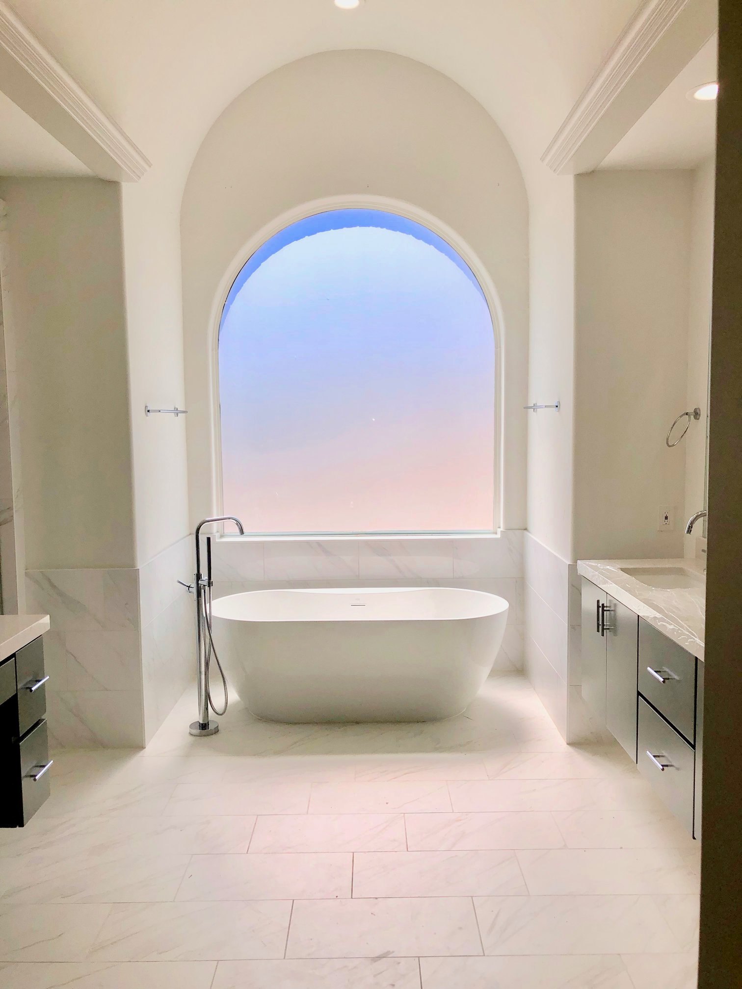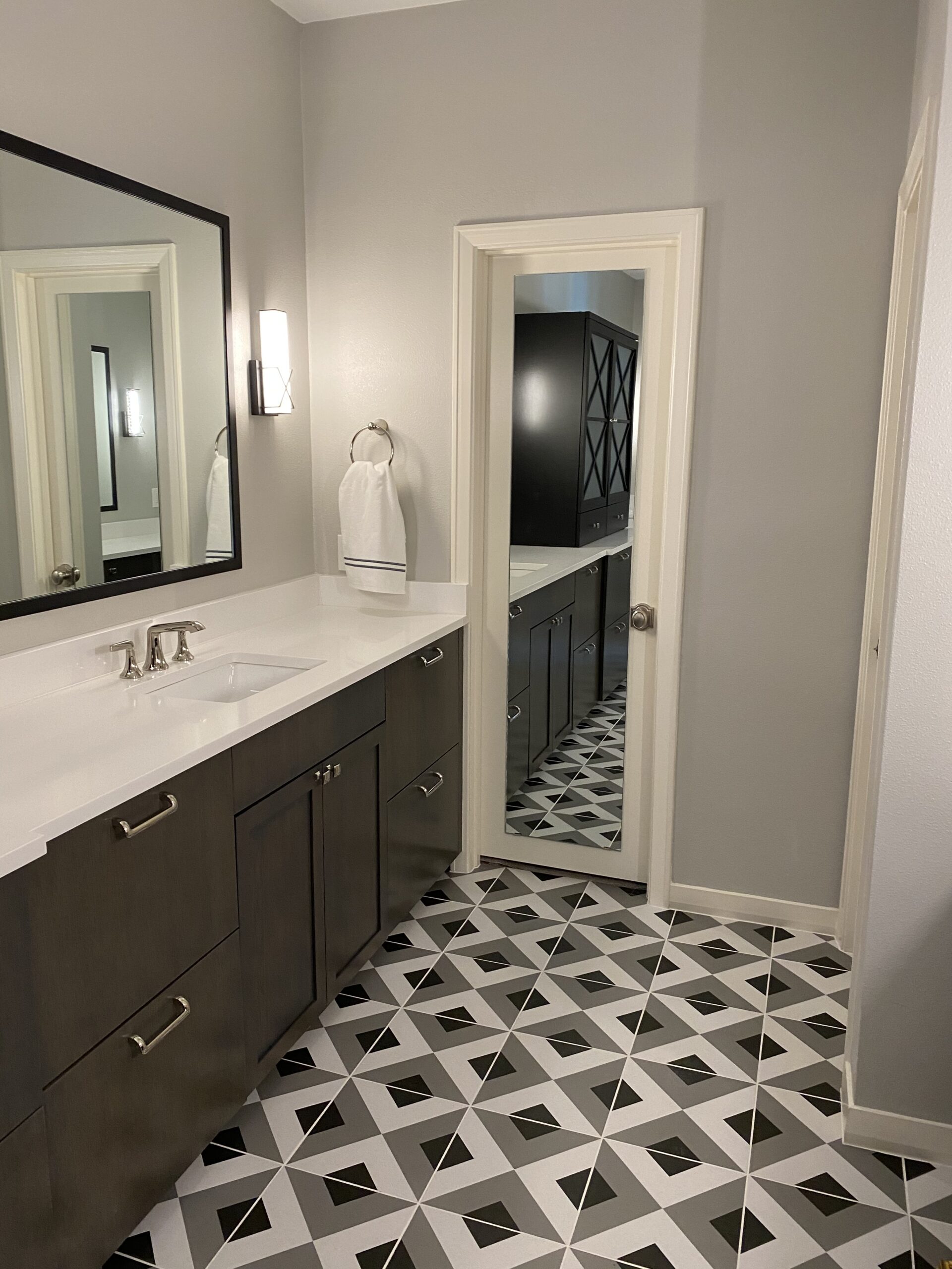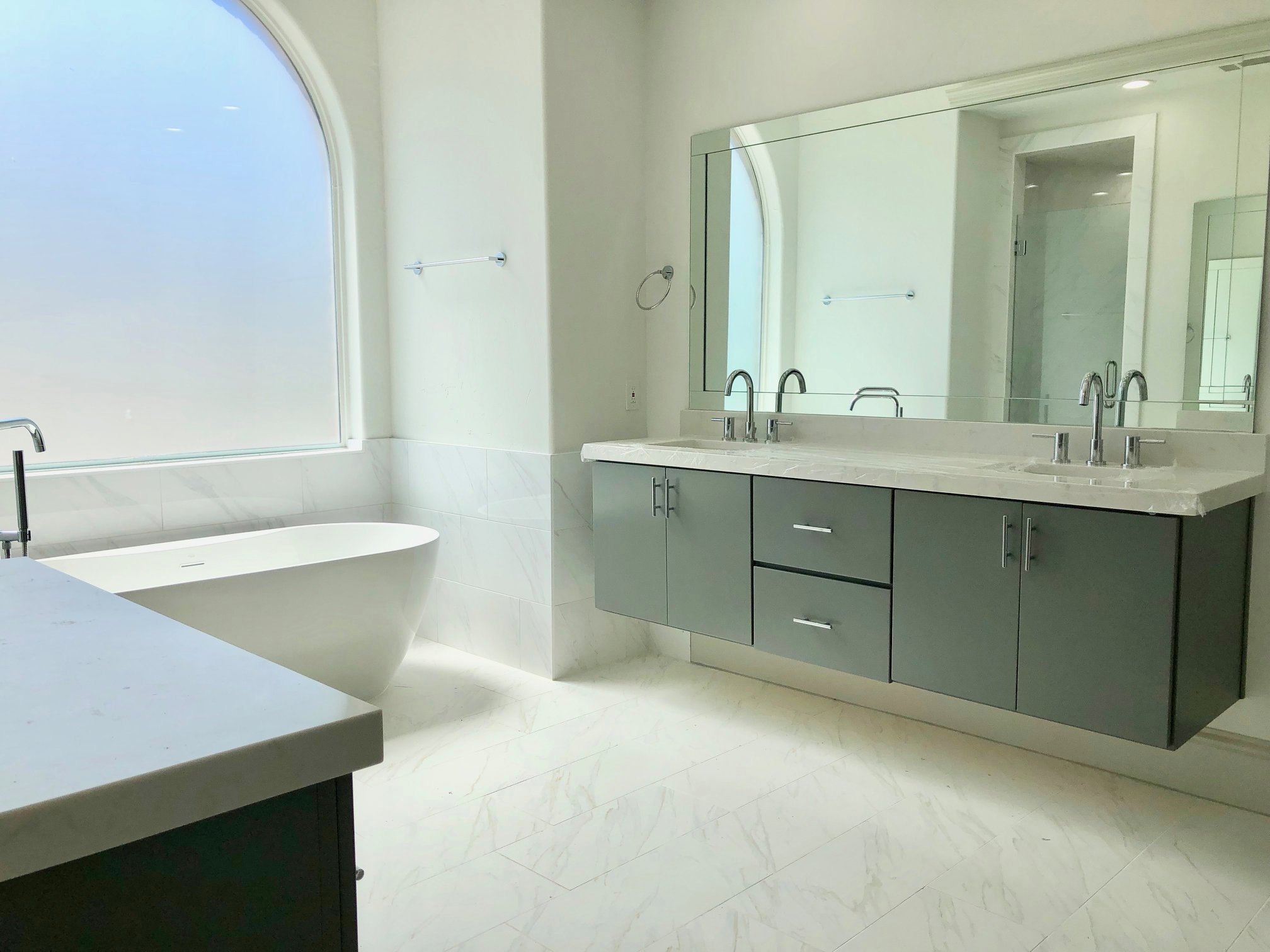 Plano full bathroom make over to make it modern and to match the rest of the house. Floating cabinets, modern hardware and a beautiful free standing tub that fits in the space perfectly.