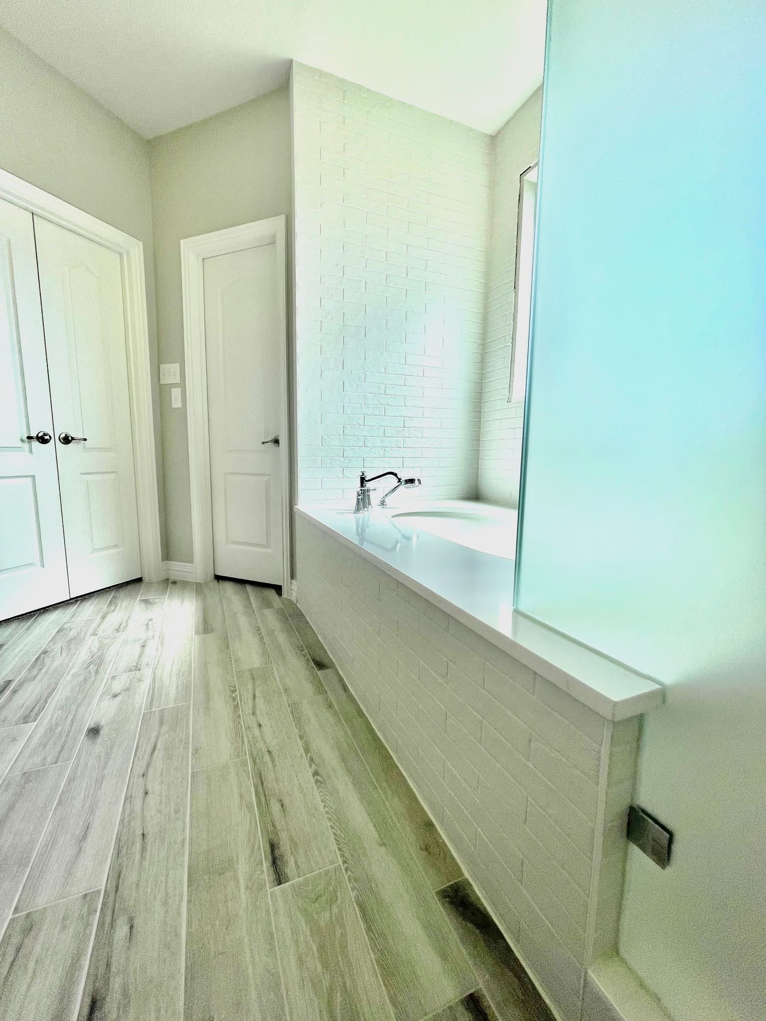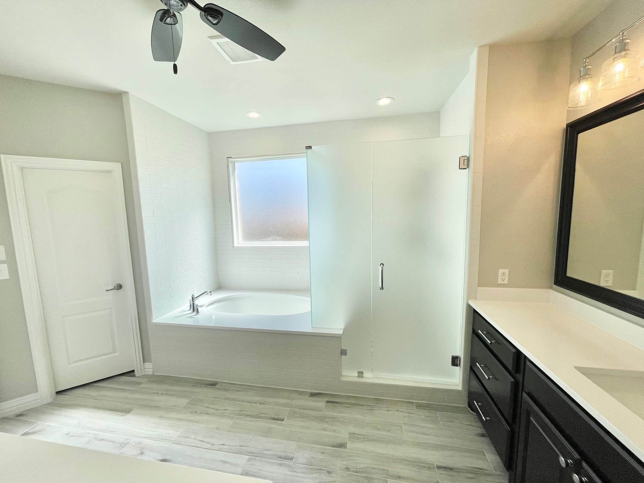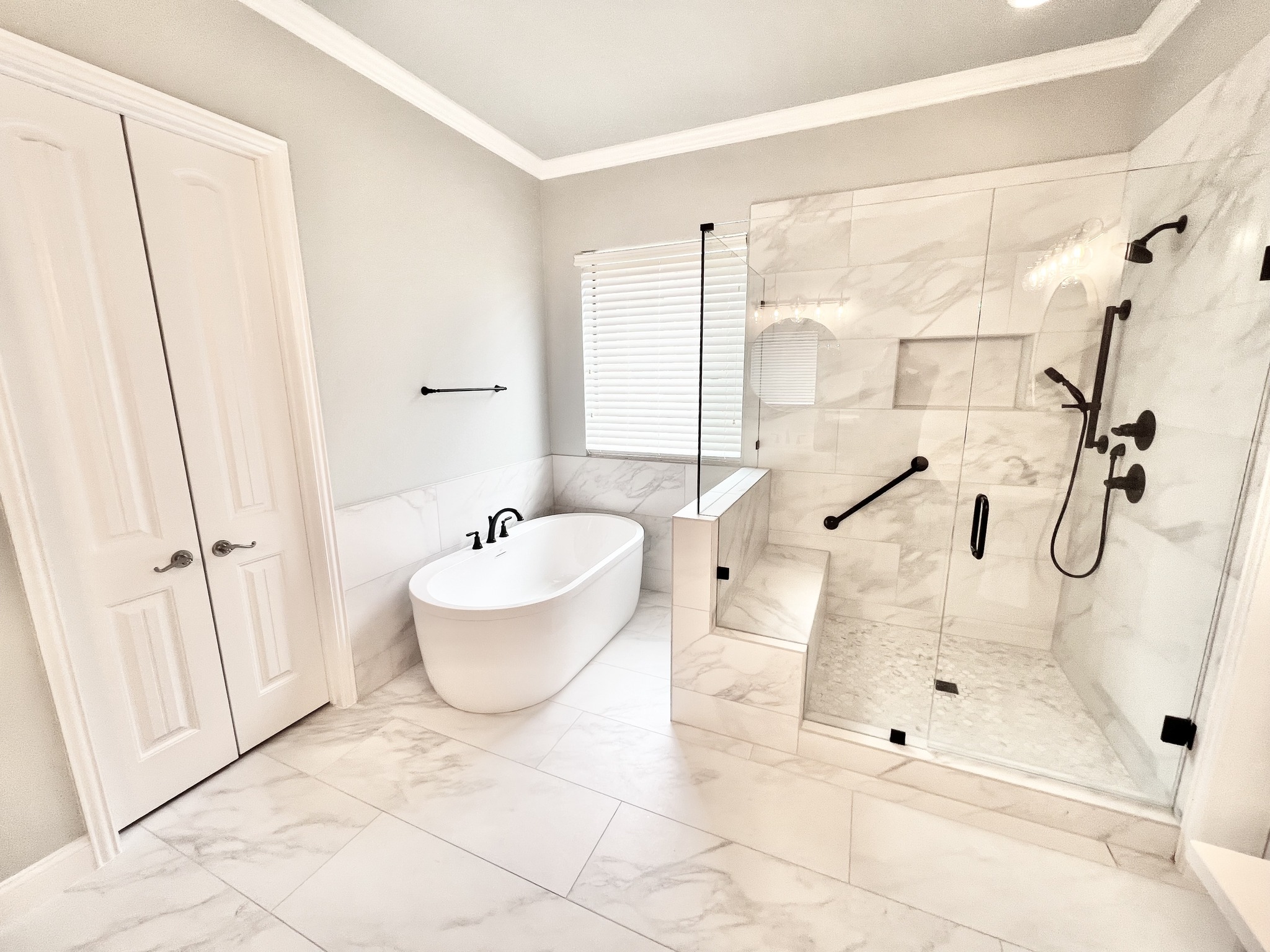 This Frisco bathroom remodel was a total gut with the bathtub put on top of a quartz deck. Dallas Remold & Design installed frosted semi frameless shower glass. The master closet was remodeled as well and tile was installed in both areas. We Installed a new ceiling fan in the center of the bathroom. New custom built in mirrors were installed. This project turned out beautiful.