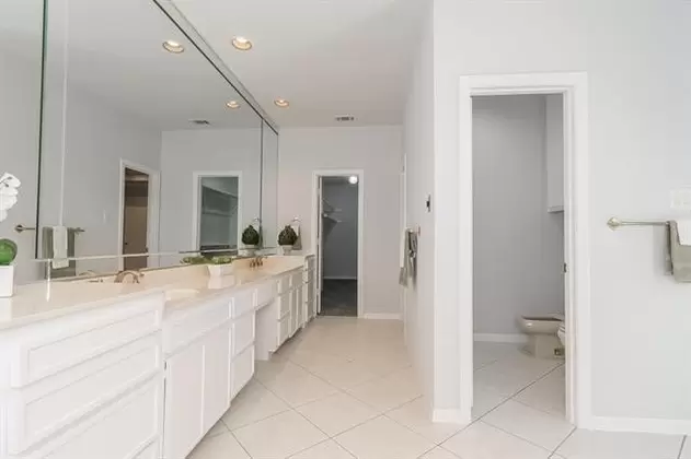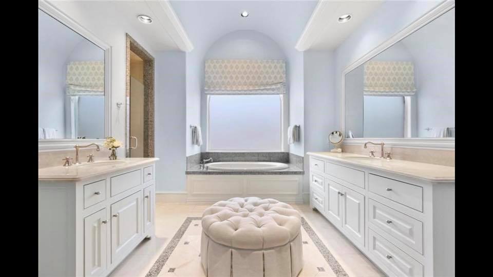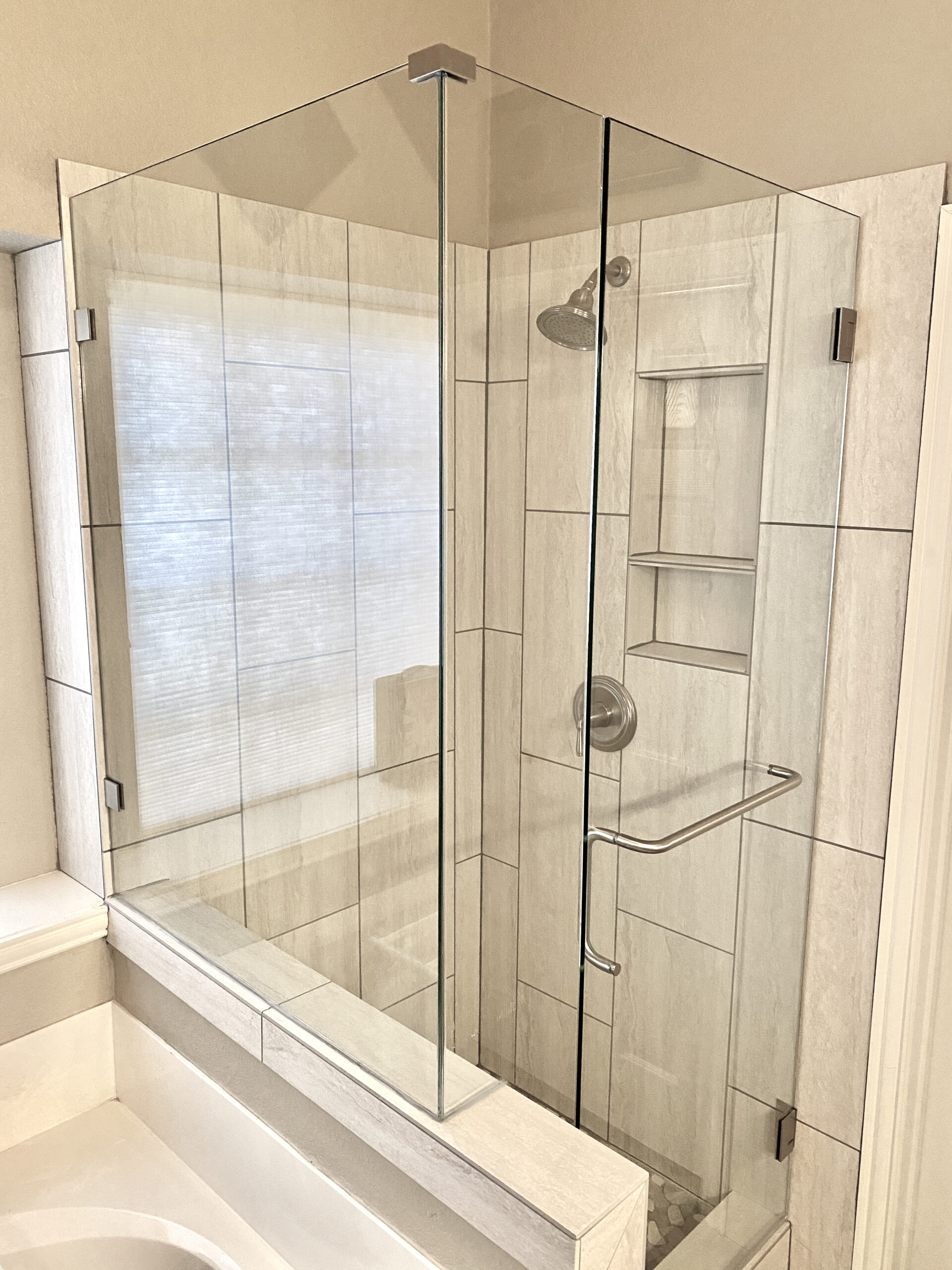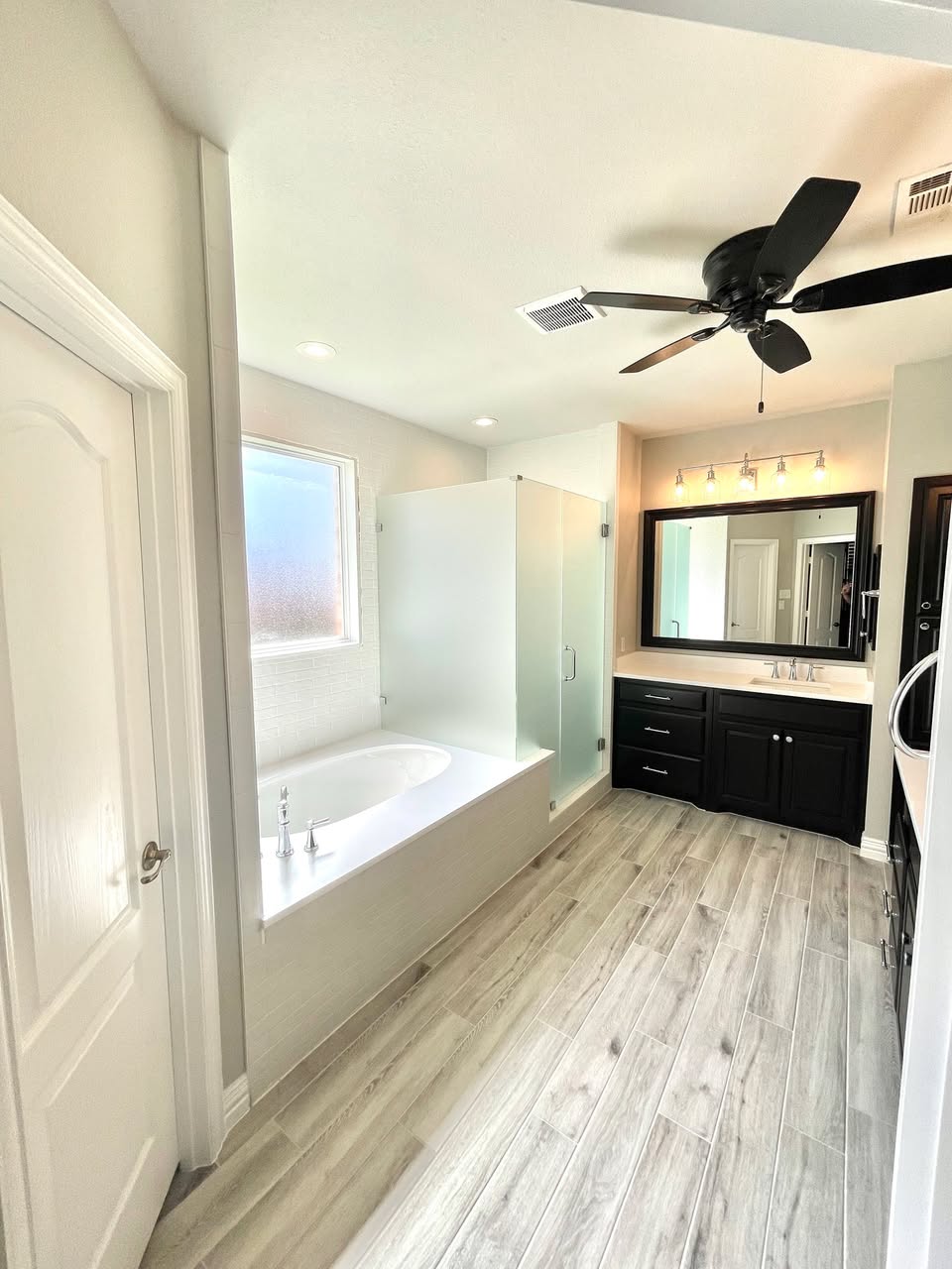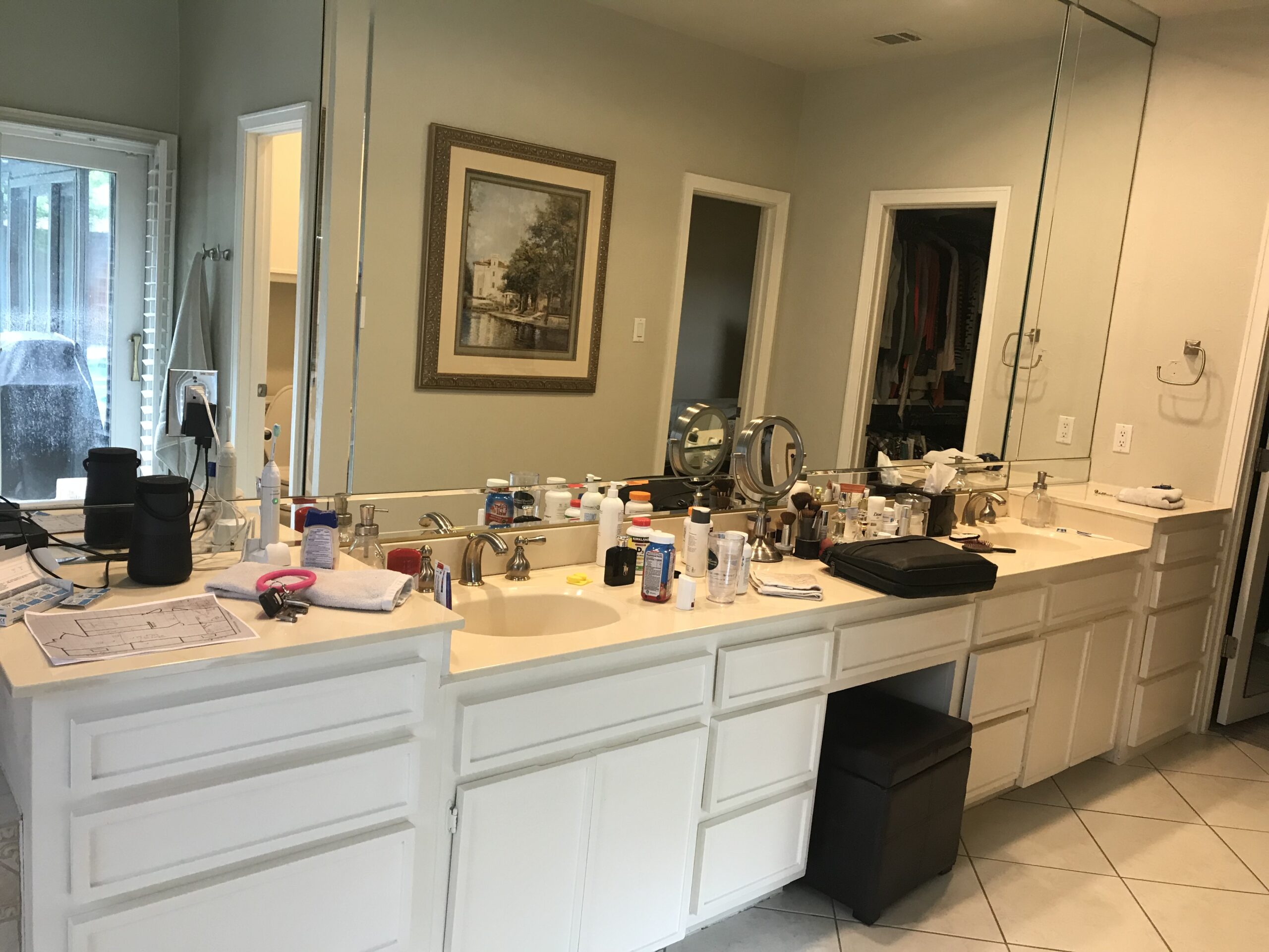 This Frisco bathroom remodel was a total gut with the bathtub put on top of a quartz deck. Dallas Remold & Design installed frosted semi frameless shower glass. The master closet was remodeled as well and tile was installed in both areas. We Installed a new ceiling fan in the center of the bathroom. New custom built in mirrors were installed. This project turned out beautiful.