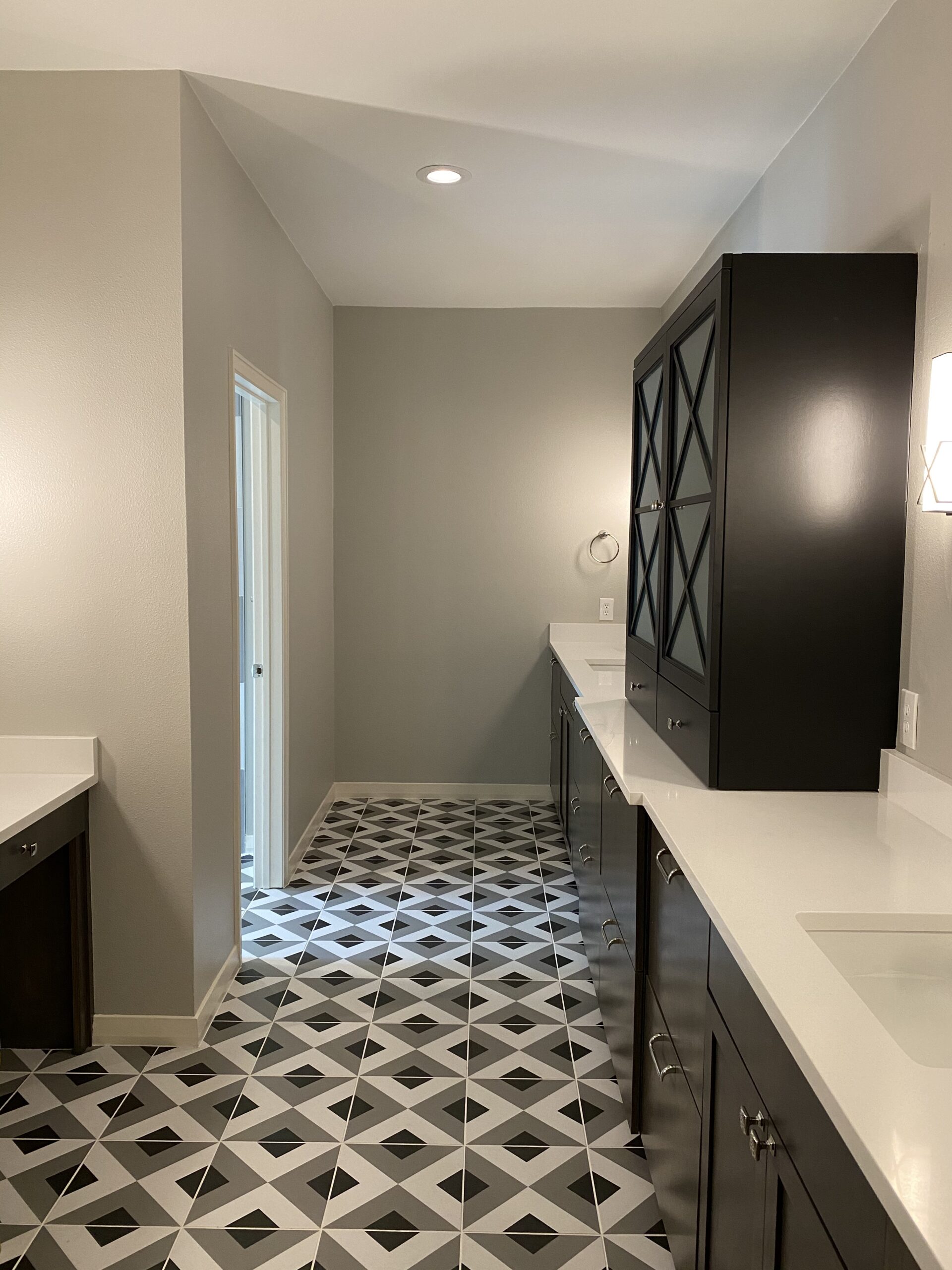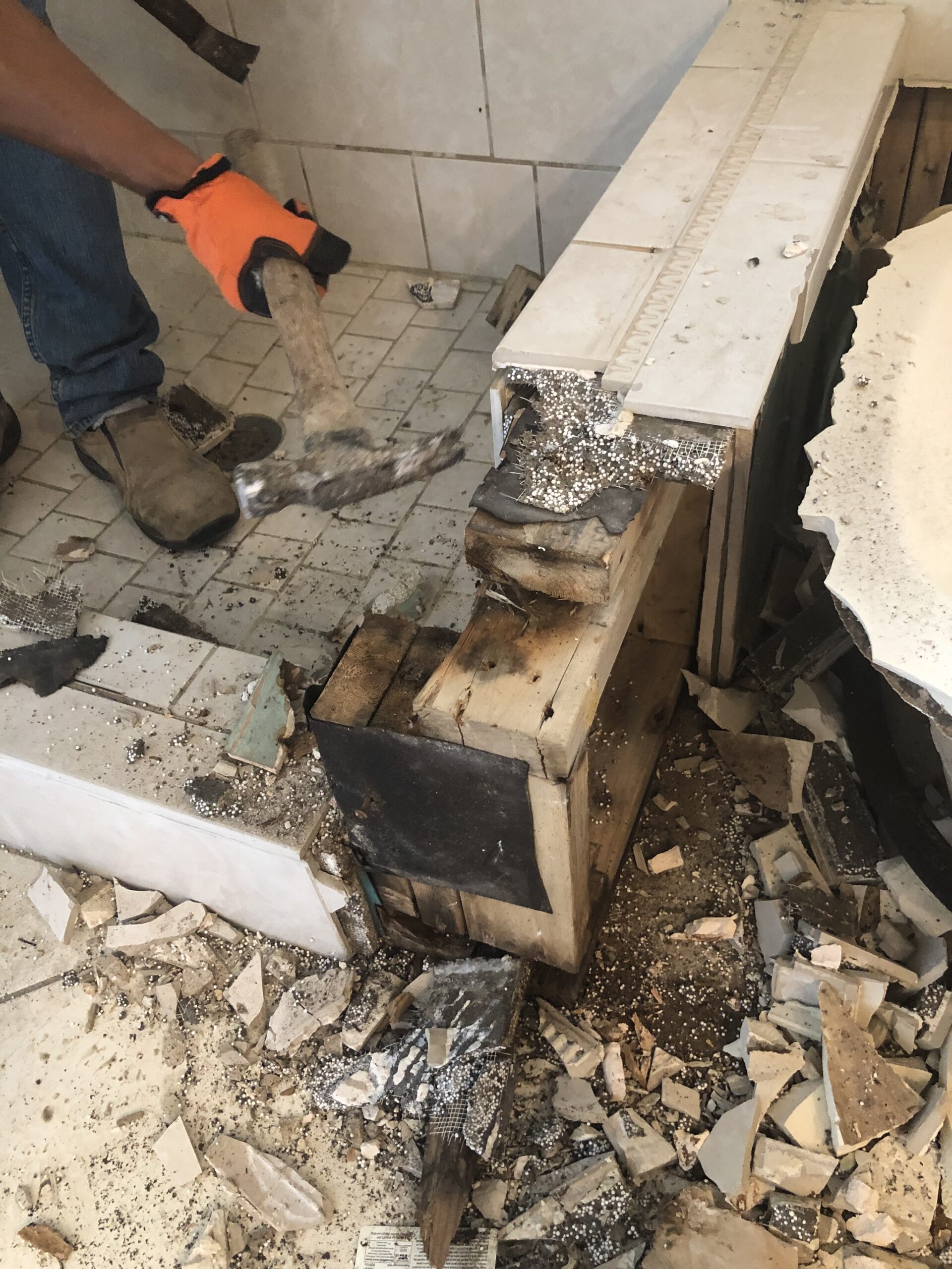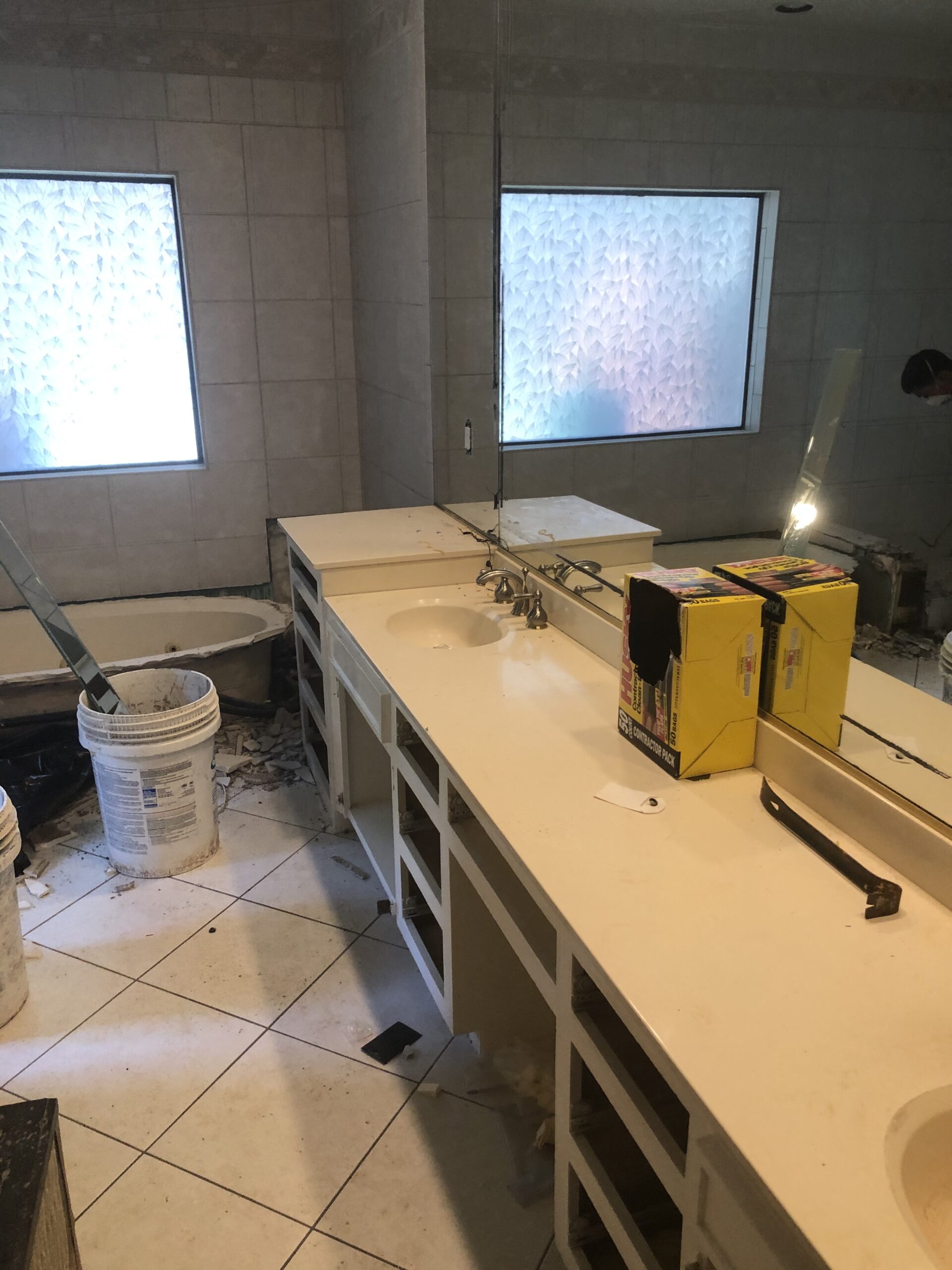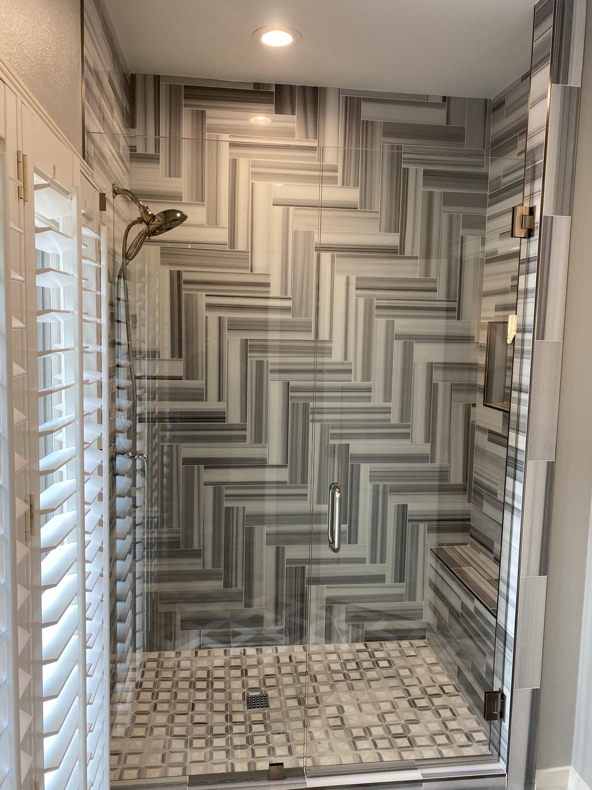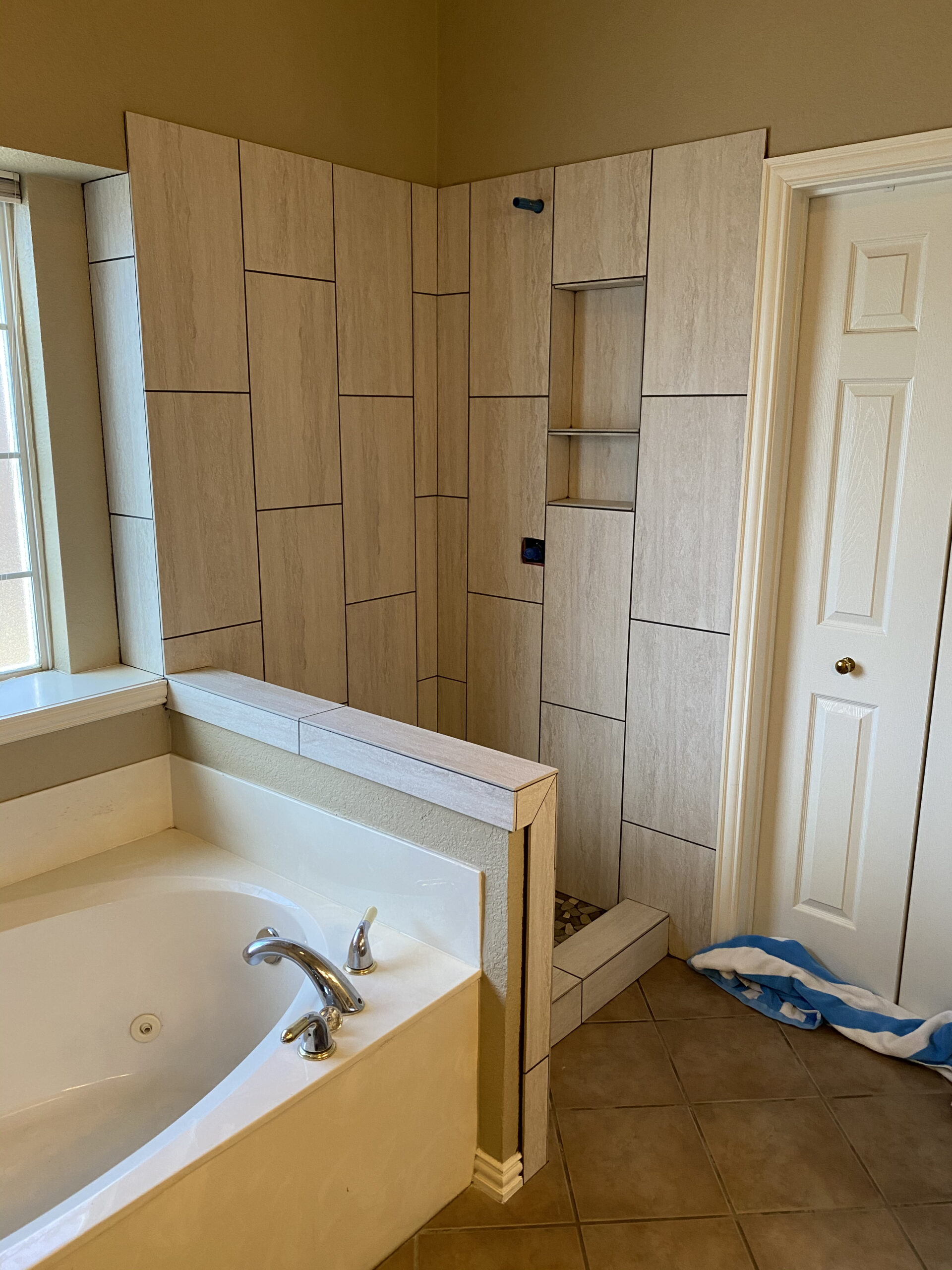 This Dallas remodel she shower and tub area was rotten and smelling like mold. The bathroom was gutted walls were moved and shower was framed in. If you like herring bone and busy this is your shower.